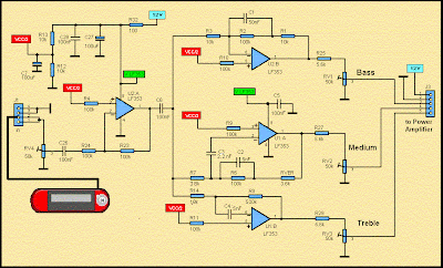 Pada rangkaian pre-amp dan tone controller memakai dua buah IC LF353. IC ini memiliki dua operational amplifier masukan JFET. Penguat pertama berperan sebagai pre-amp untuk memperkuat sinyal audio dari MP3 player. Kemudian tiga op-amp yang lain berperan sebagai pemecah sinyal audio tersebut menjadi tiga bandwidth yaitu bass, medium dan treble yang besarannya dapat disesuaikan melalui RV1, RV2 dan RV3.