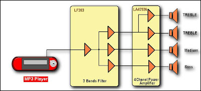 Berikut ini adalah blok diagram load speaker aktif Amplifier MP3 150 Watt Untuk Car Audio. IC LF353 akan memecah sinyal audio menjadi tiga band dan kemudian sinyal-sinyal tersebut diperkuat oleh IC LA47536. Dalam pengaturan stereo, amplifier ini dapat mengangkat 8 unit speaker high sound sehingga akan menghasilkan dentuman suara yang dahsyat.