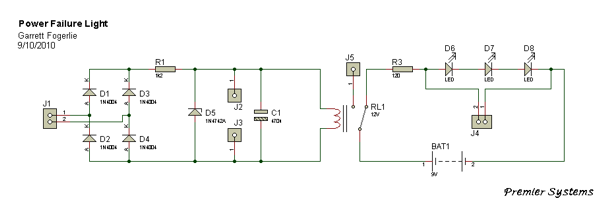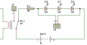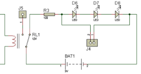 Relay yang digunakan adalah jenis SPDT 5VDC dan switch relay adalah NC (Normally Closed). Ketika koil relay mendapat tegangan 12 VDC switch NC akan terbuka dan memutuskan hubungan antara baterai dan LED, selama dalam kondisi ini LED tidak akan menyala. Tapi ketika tidak ada sumber tegangan pada koil relay (PLN padam), switch relay akan kembali ke keadaan awal (closed) sehingga tegangan 9 VDC dari baterai mengalir ke LED melalui R1. Dalam keadaan ini LED D6 - D8 menyala.